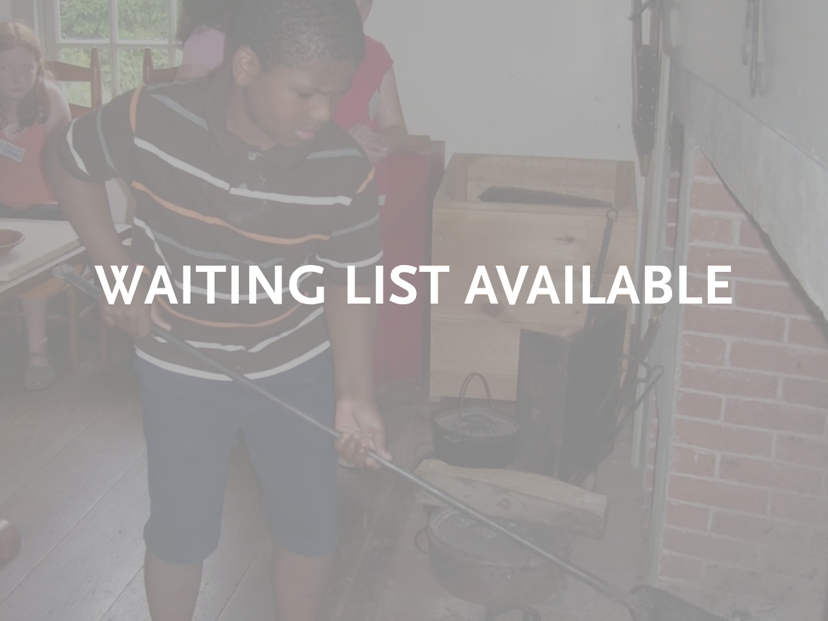 Full! Waiting List Available.Investigate how foods have been grown, harvested, preserved, cooked and eaten through time. Try out a variety of period recipes on the hearth and 19th-century cookstove. Learn about convenience foods from hardtack to TV dinners. Discover foods that immigrants brought from all over the world and explore how dining etiquette has changed through time. And even create and cook your own recipes. At the end of the week, campers will have full stomachs and a variety of recipes to try at home.